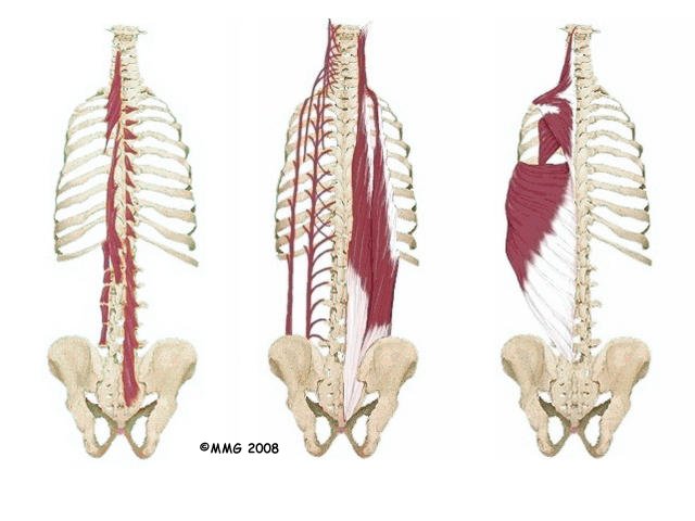 The muscles of the thoracic spine are arranged in layers. Those closest to the skin's surface run from the back of the vertebrae to the shoulder blades. Others wrap around the rib cage and connect to the shoulders. Strap-shaped muscles called erector spinae make up the middle layer of muscles. These muscles run up and down over the lower ribs and thorax (the rib cage), and cross to the low back. The deepest layer of muscles attaches along the back of the spine bones, connecting each vertebrae together. Muscles also connect from one rib to the next. The muscles of the thoracic spine have many functions including moving the thorax, as well as assisting in trunk stability.